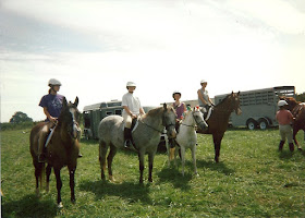 | JM on her pony Star, Me on my horse Gypsy, and JAG on her pony Rosie (not 100% sure who the bay is) Gotta love those old school white helmets!!!!! |